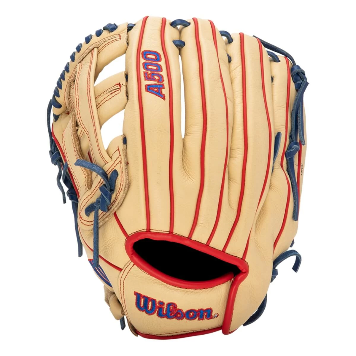 Start a young career off right with this Wilson A500 baseball glove. This handsome glove, designed with a blonde, blue, and red color scheme, comes engineered for success with top-grain leather. It feels lightweight and does not sacrifice performance, flexibility, or comfort. It provides a flexible, ready-to-play feel for all young position players. Its real leather laces holding together its various parts add a degree of authenticity and give it practical strength and durability over the course of its life. Additionally, its Double Palm Construction on the front of the mitt keeps it comfortable on the hand, balanced while in play, and free of wrinkles over the course of many games.